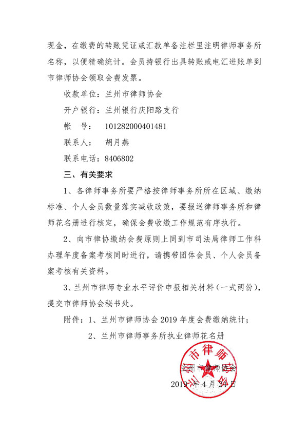 兰州市律师协会关于做好2019年度会费收缴工作的通知