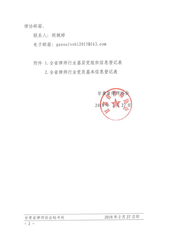 现将《甘肃省律师协会关于对全省律师行业党建工作有关数据进行统计的通知》予以转发,请各律师事务所按照要求填报后于2018年3月10日前上报兰州市律师协会(邮箱:lzslsxh@sina.com),由市律协集中汇总后上报省律协。