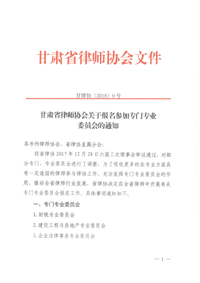 兰州市律师协会关于转发《甘肃省律师协会关于报名参加专门专业委员会的通知》的通知